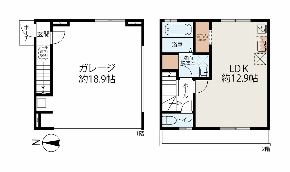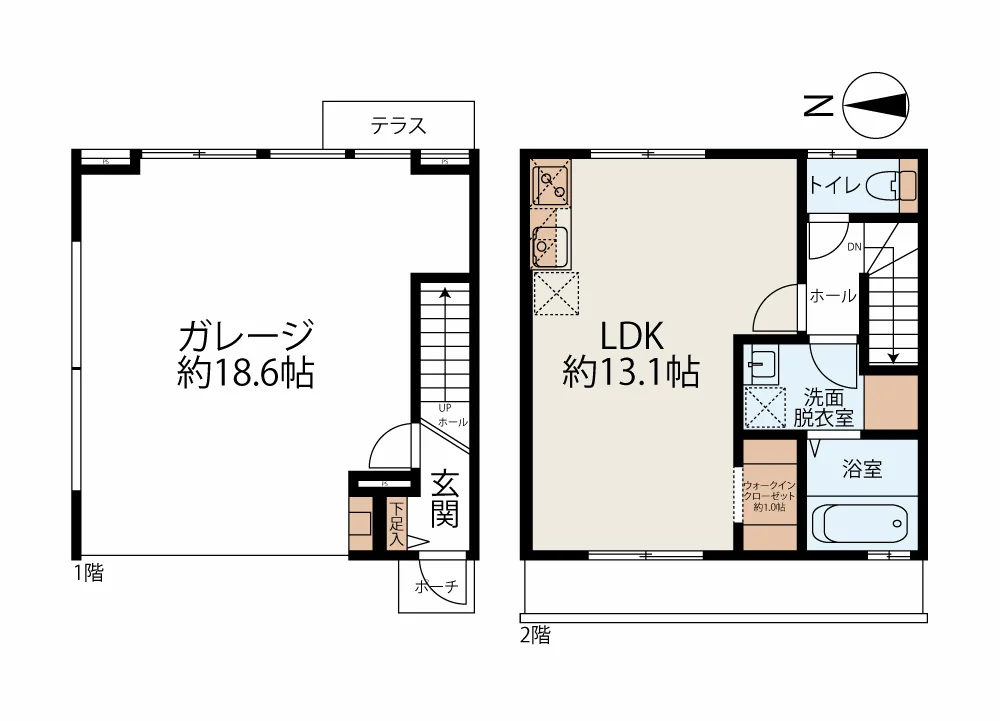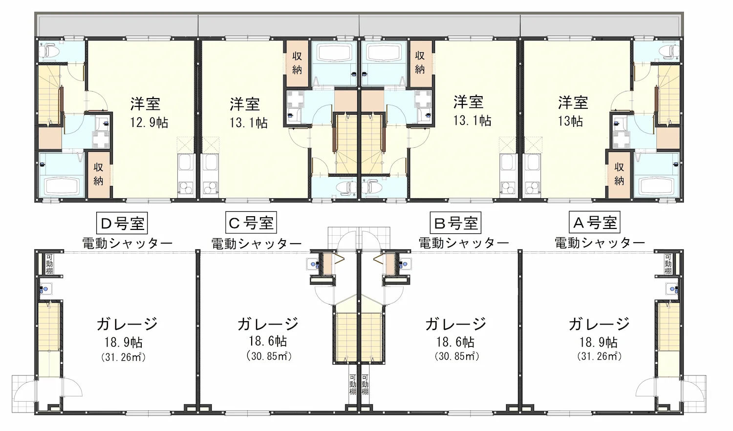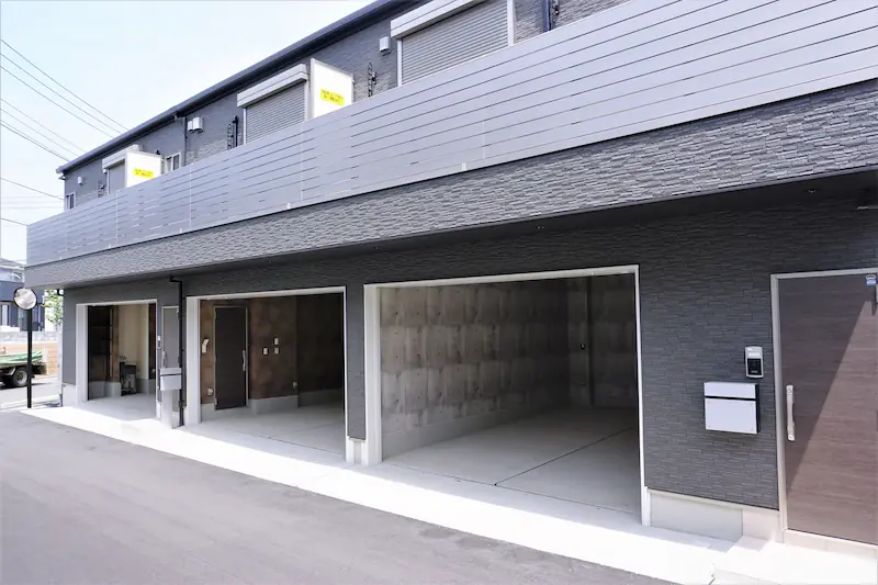 奥に向かって広がる台形状の敷地にはA棟(A/B/C/D号室)、B棟(E/F/G/H号室)がV字に配置され、大きく3タイプある鉄骨造2階建て。2F居室は11帖〜13.1帖のワンルームでバストイレ別の水回り、浴室には足を伸ばして入浴できる1616サイズのユニットバスが採用されています。余計な仕切りを設けない広々した空間で、一人暮らしや趣味を満喫するセカンドハウスを想定した間取りと言えます。